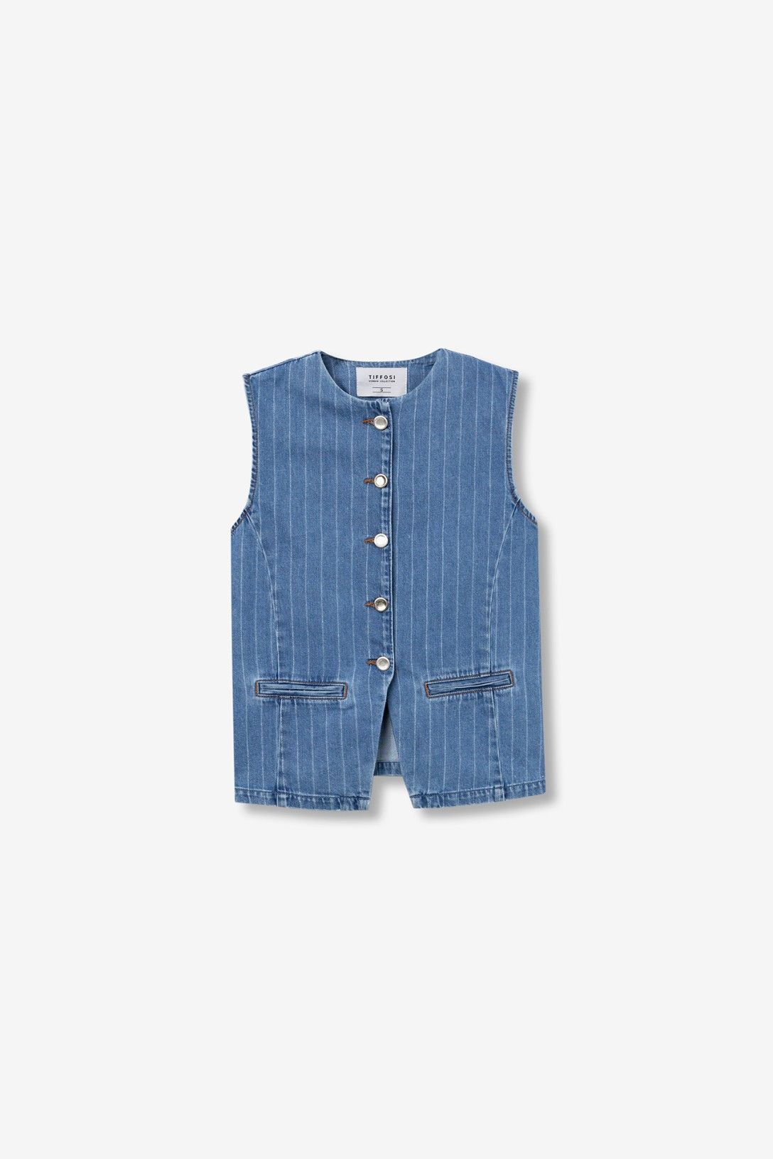 Slim-fit medium blue waistcoat with pinstripes, metallic buttons and two front pockets.