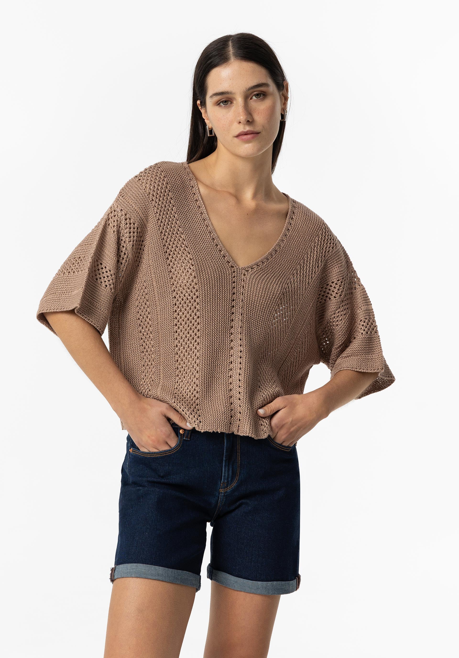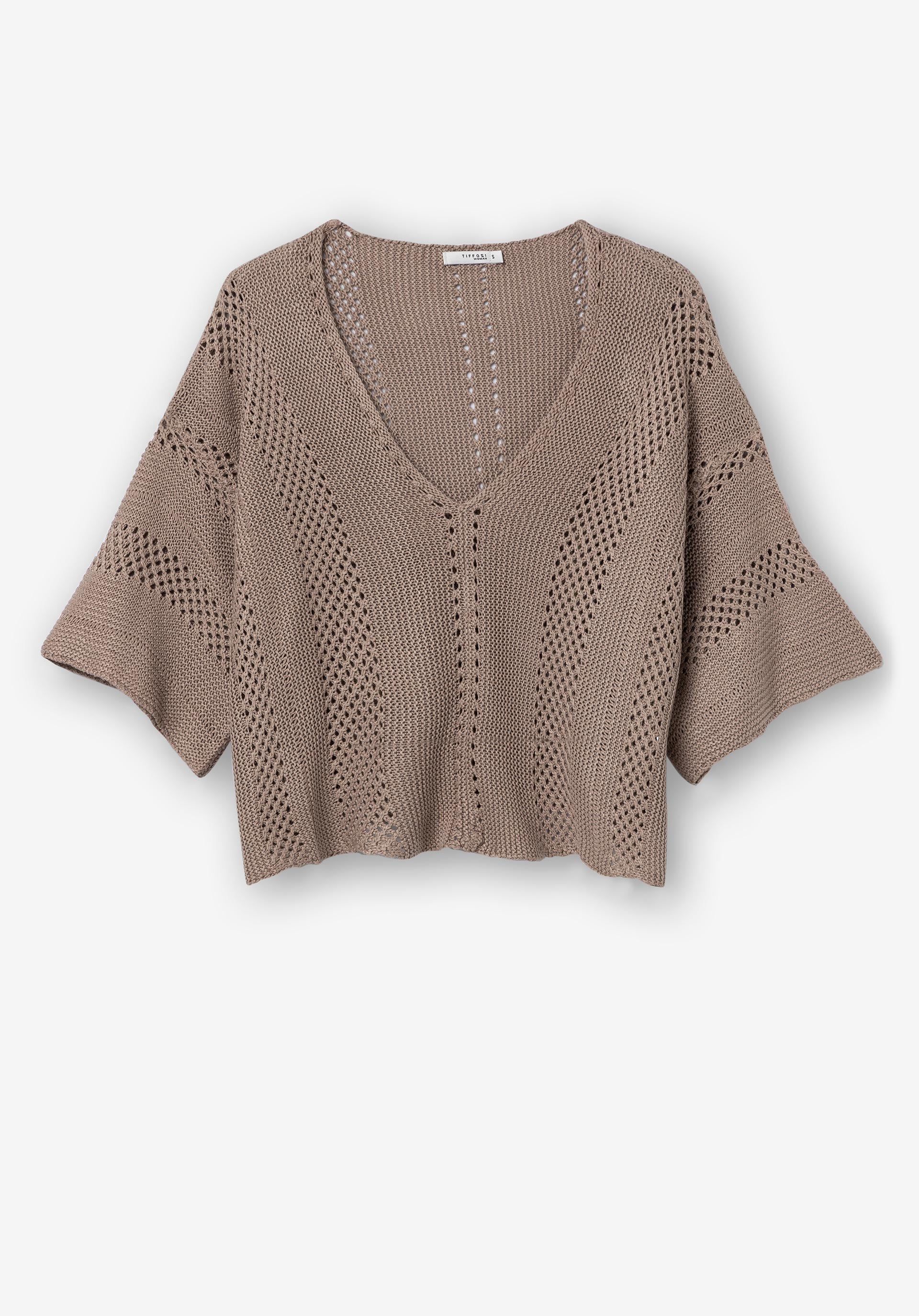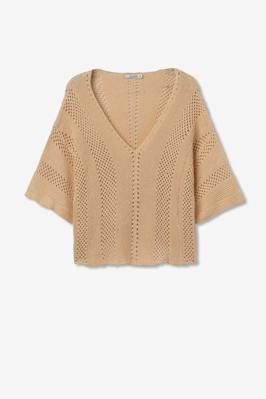 Camisola com decote em v e manga curta.