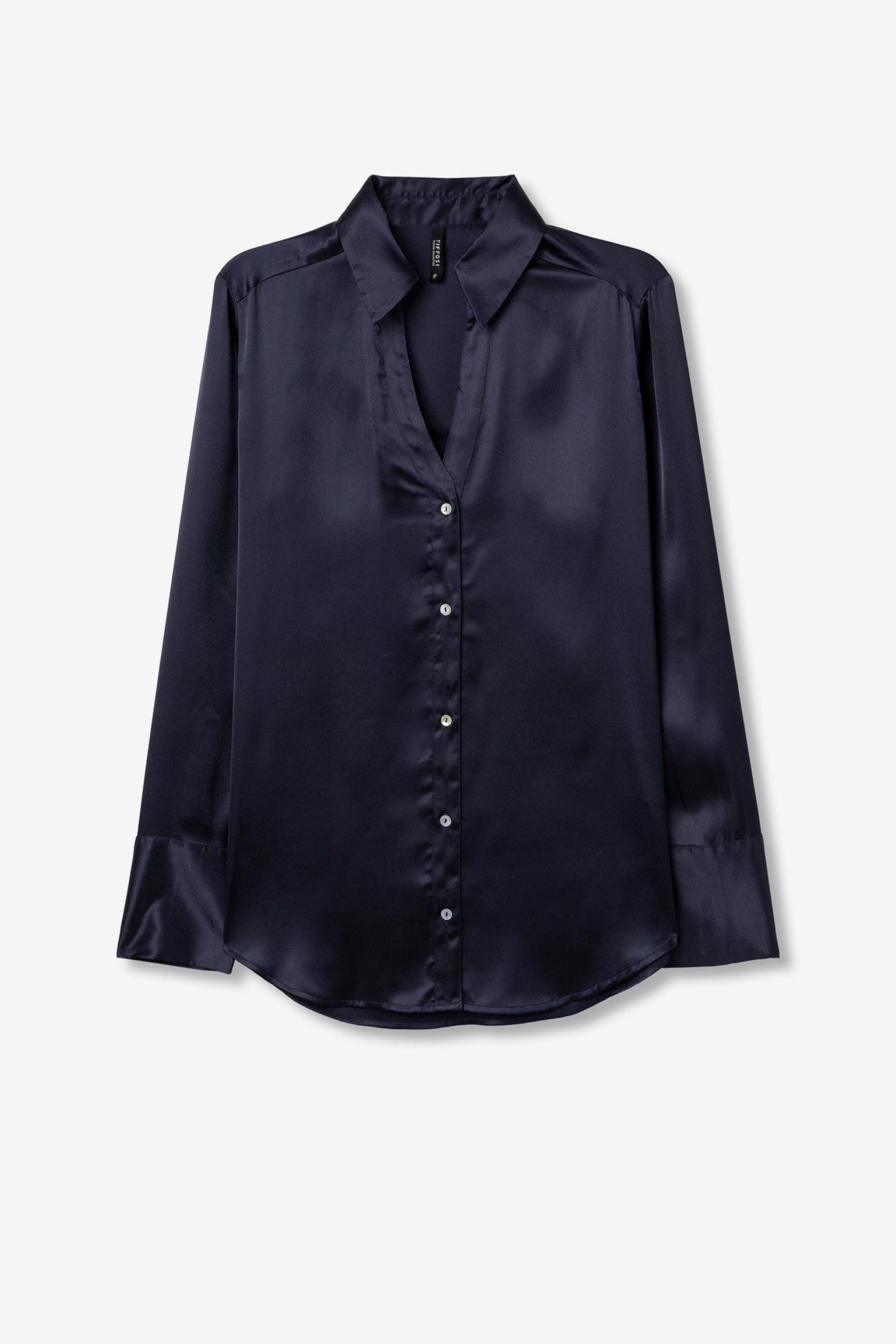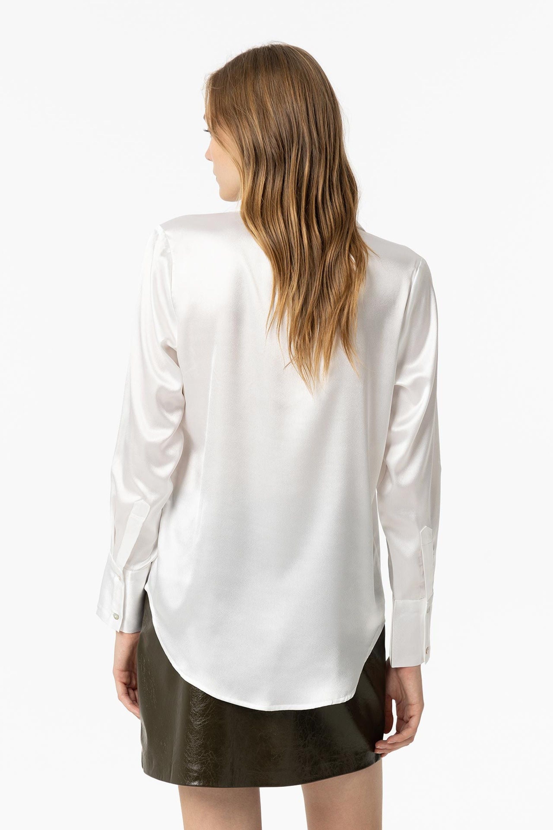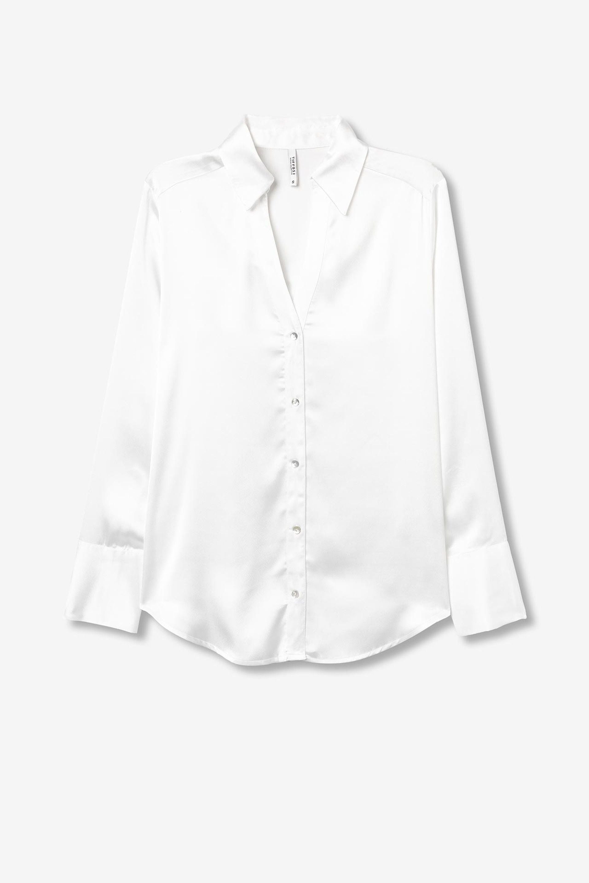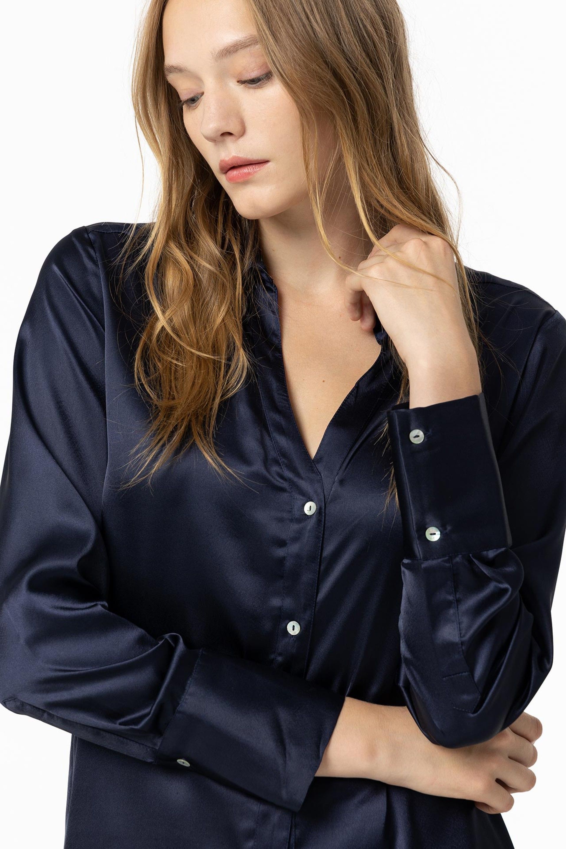 Camisa acetinada, com abertura frontal e fecho de botão de madrepérola. colarinho com decote em v, manga longa, com ajuste de botão nos pulsos e bainha curva.