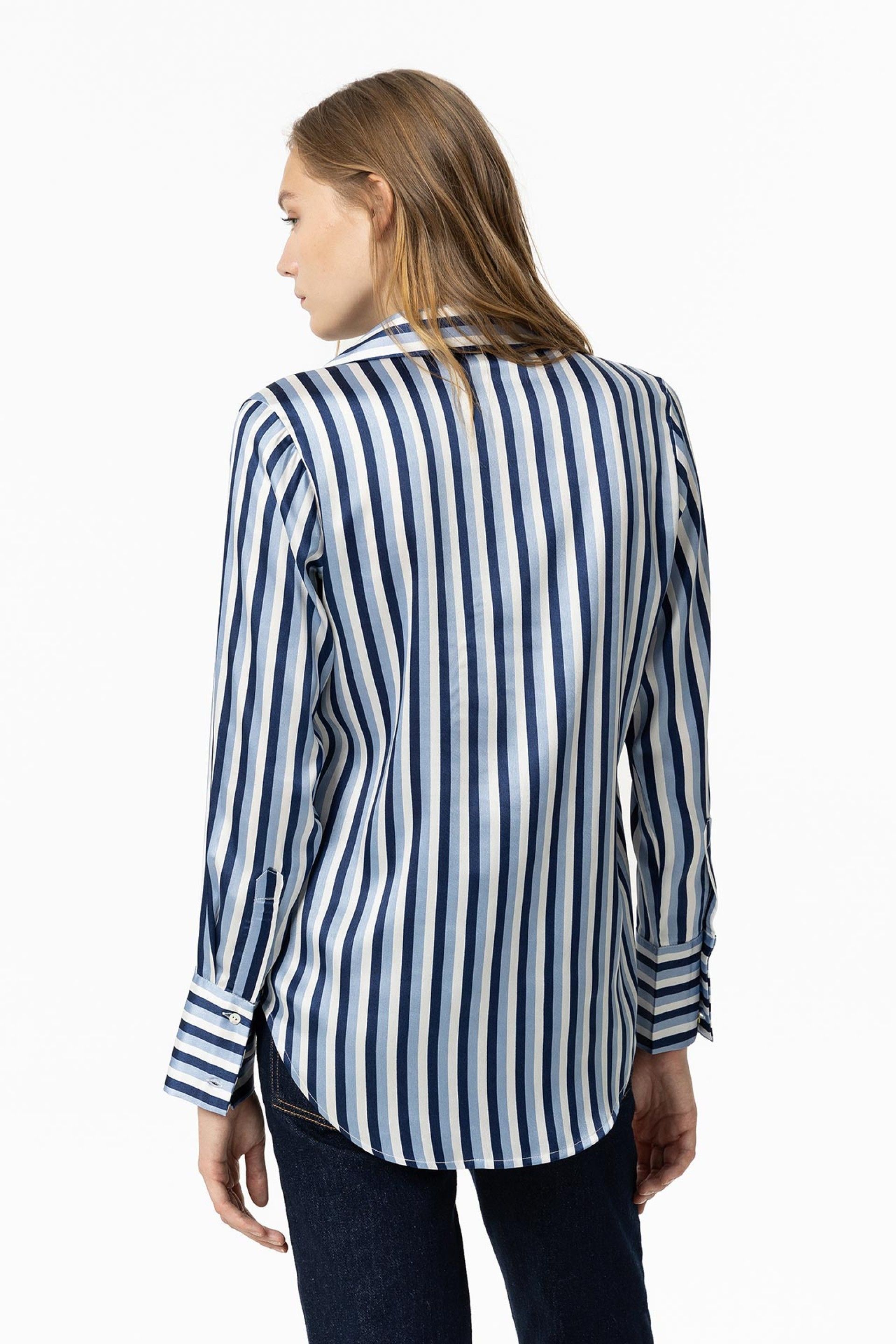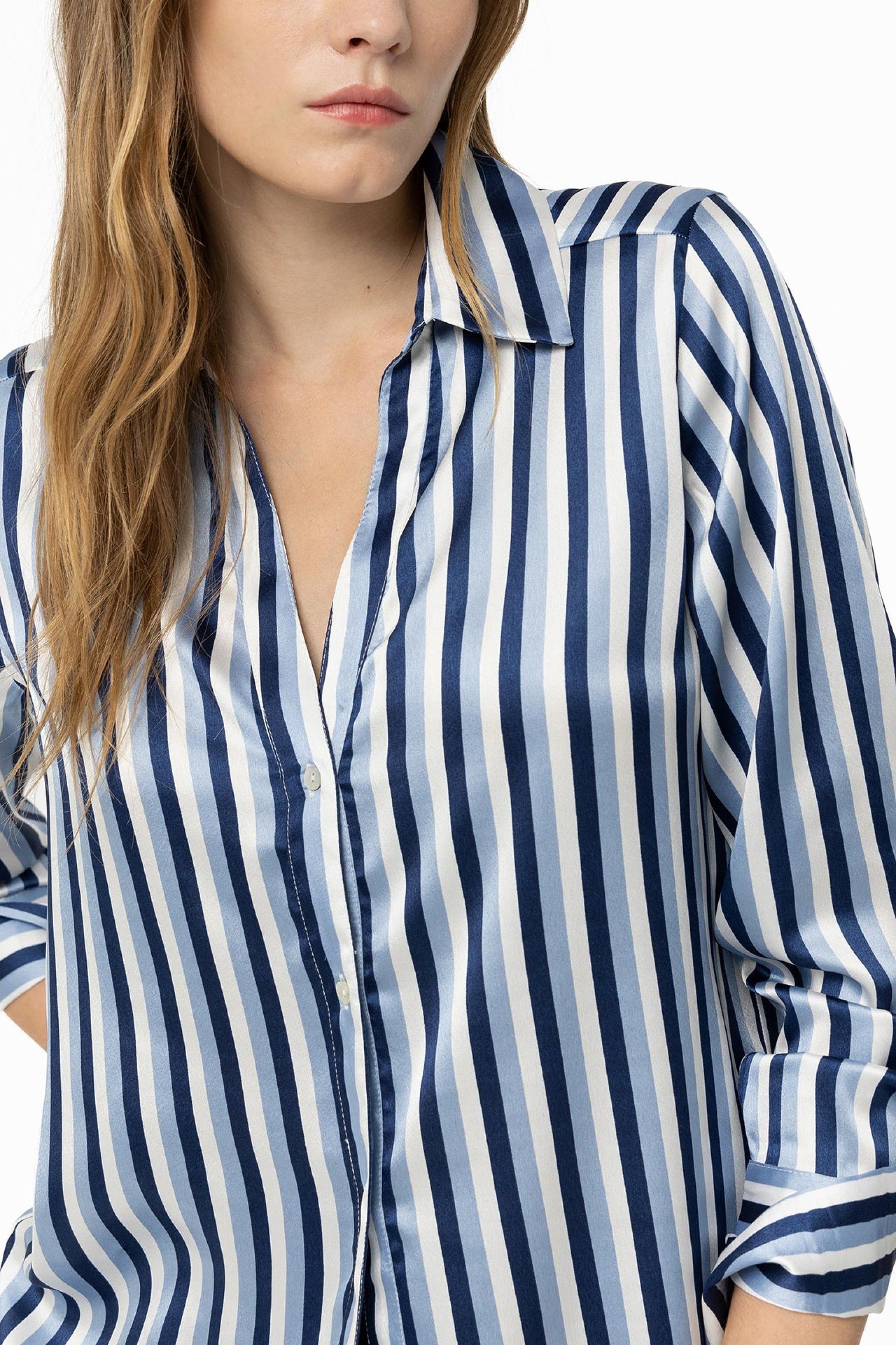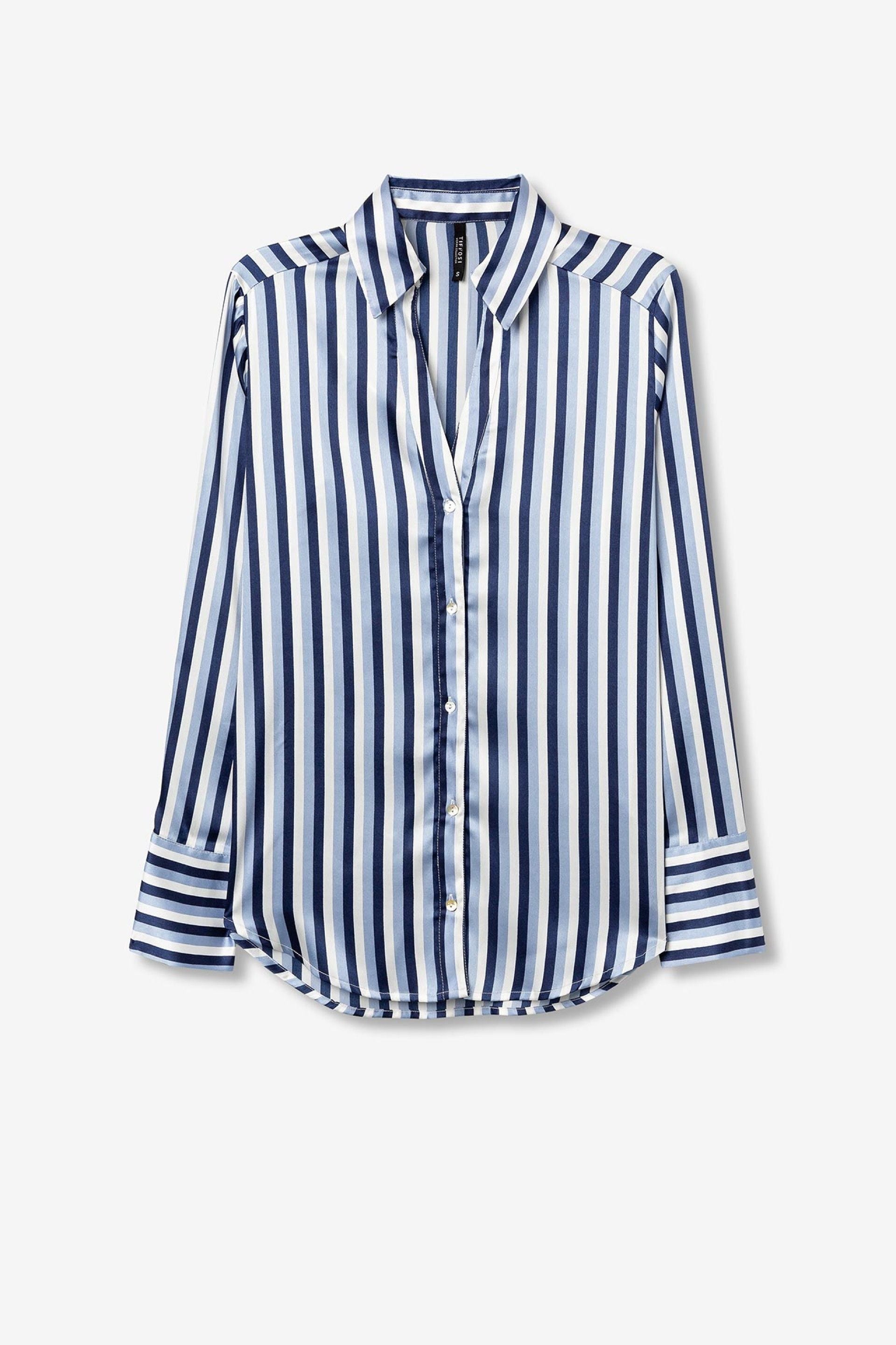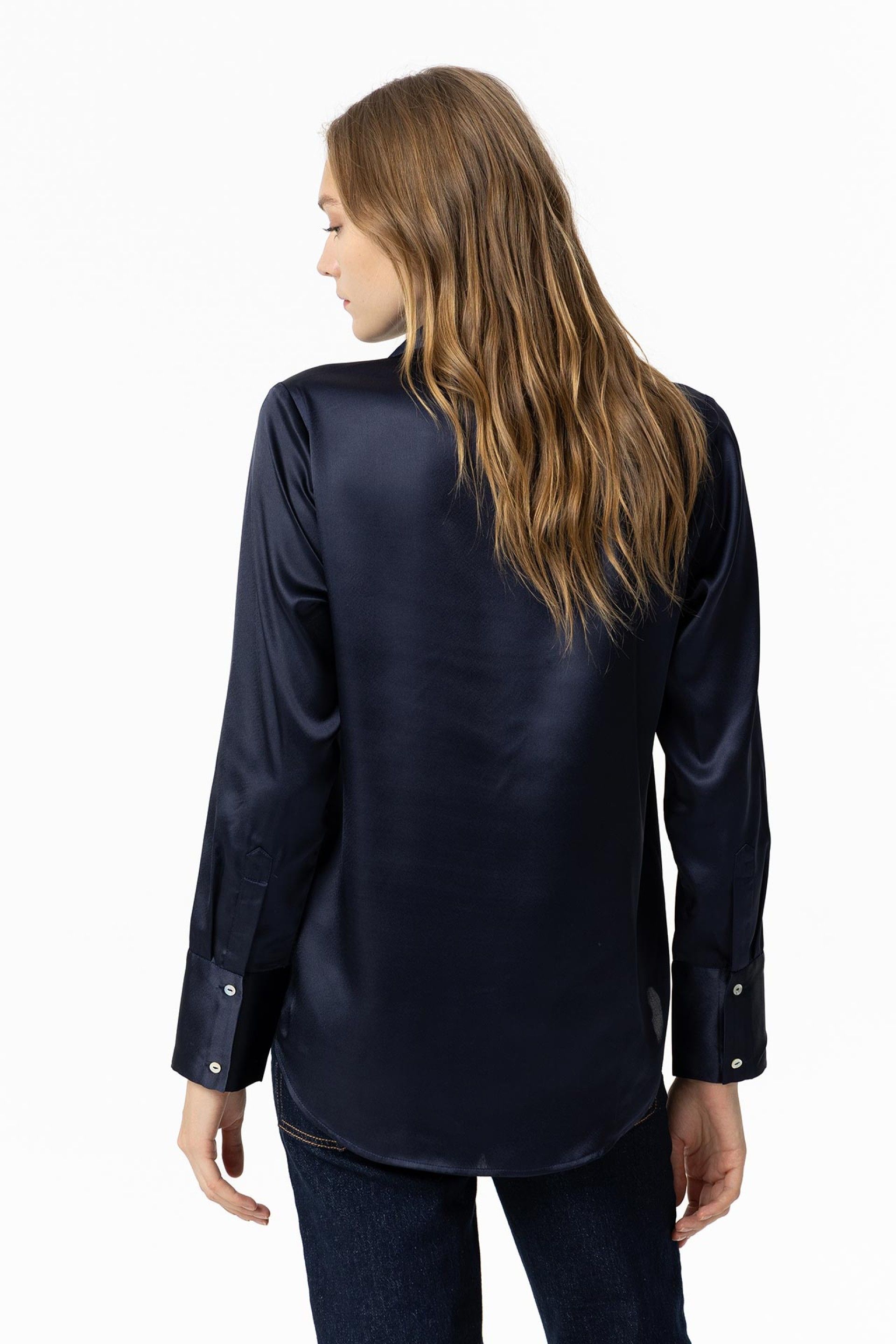 Camisa acetinada, com abertura frontal e fecho de botão de madrepérola. colarinho com decote em v, manga longa, com ajuste de botão nos pulsos e bainha curva.