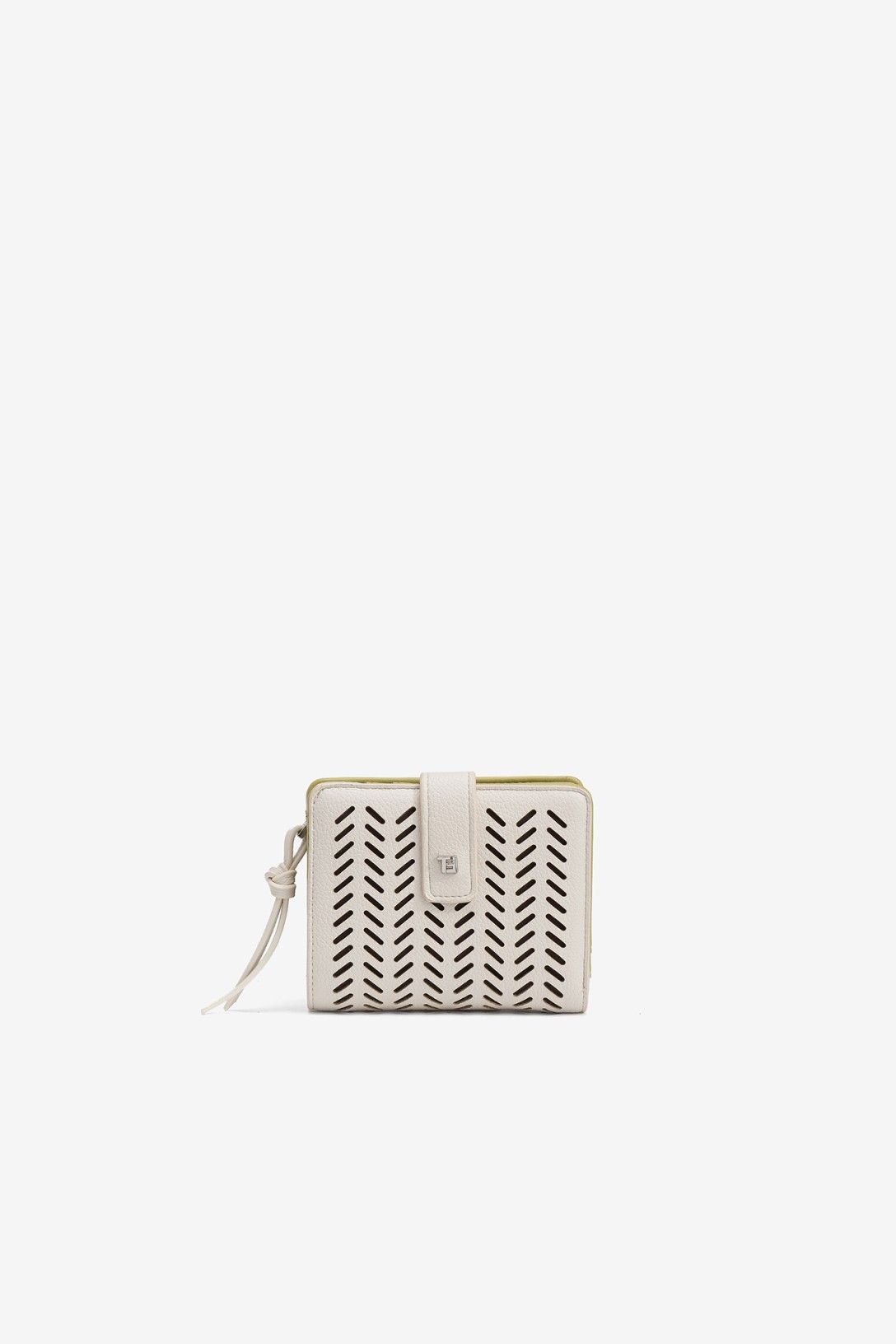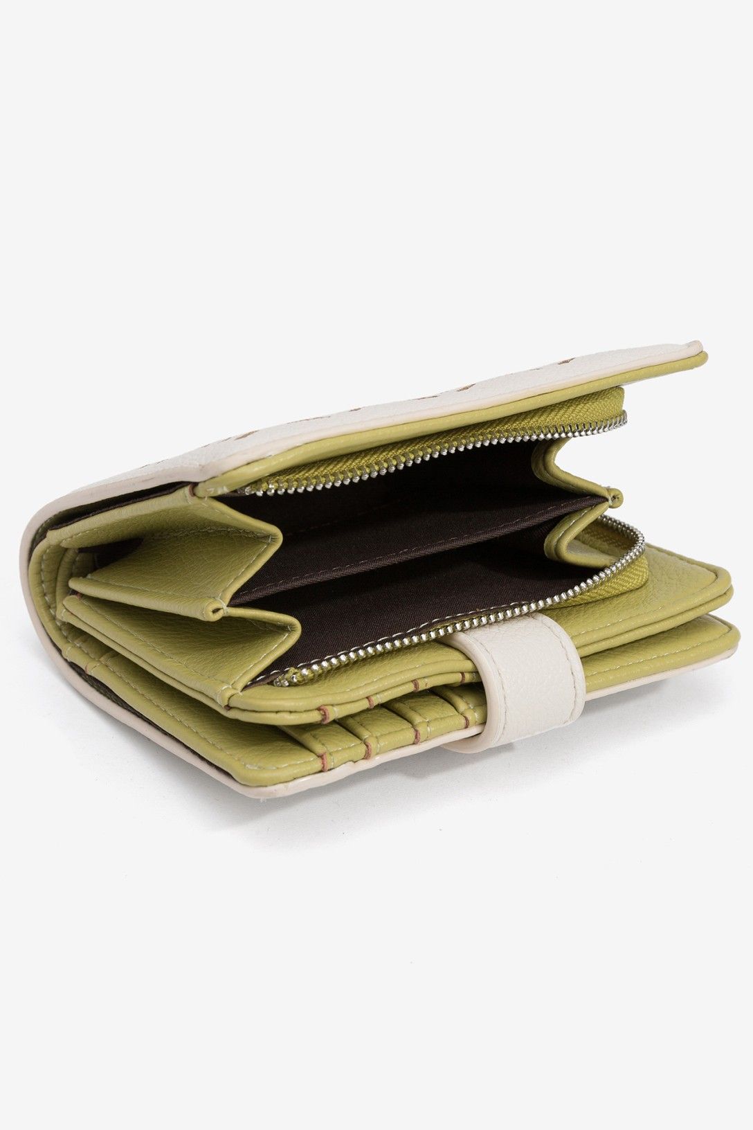 Porta-moedas bege com padrão perfurado, interior verde, fecho de correr e múltiplos compartimentos.