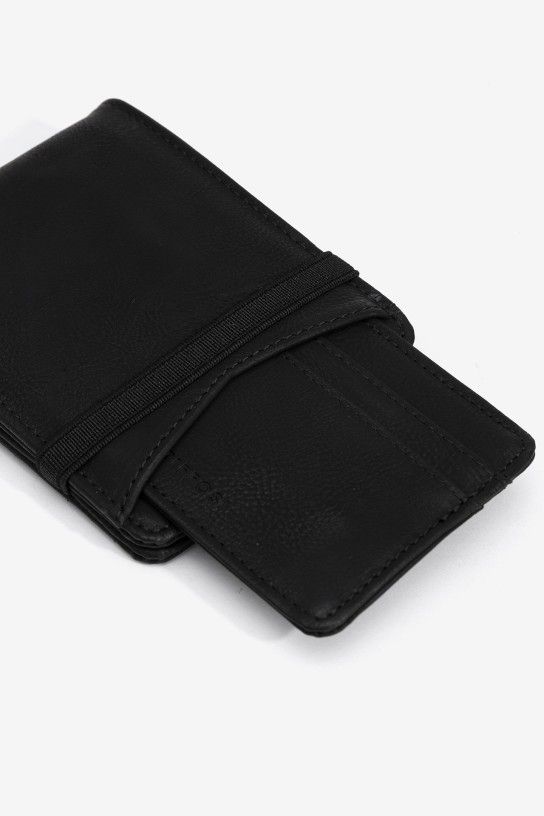 Porta-moedas de cor preta com fecho de correr e múltiplos compartimentos para cartões.