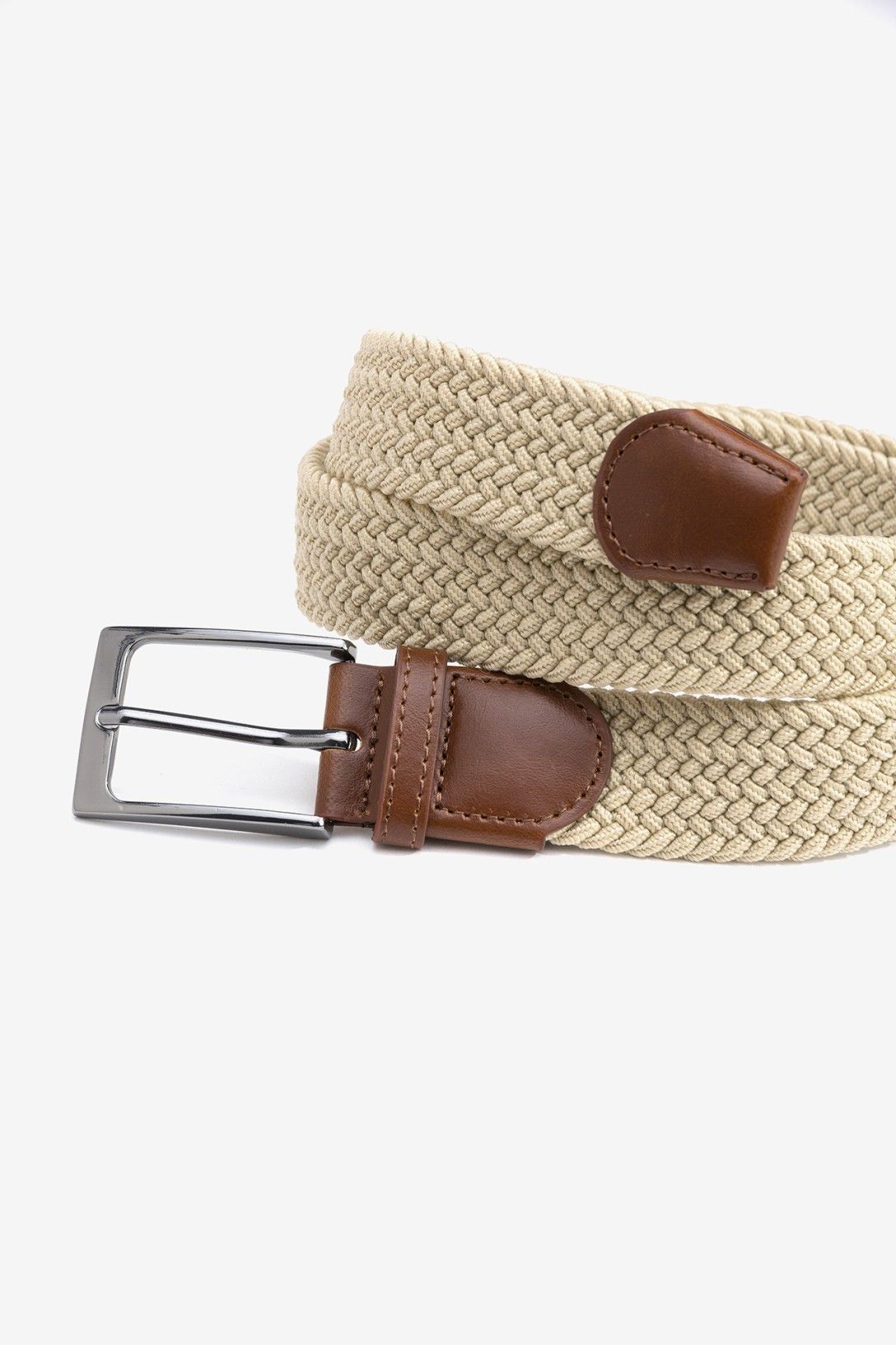 Cinto masculino em tecido cru com fivela metálica e detalhes em pele castanha.