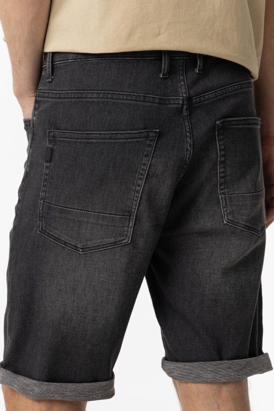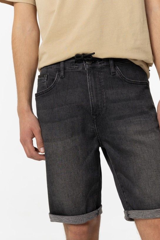 Calções com cós elástico com cordão ajustável. fecho frontal de correr e botão metálico. bolsos laterais e traseiros.