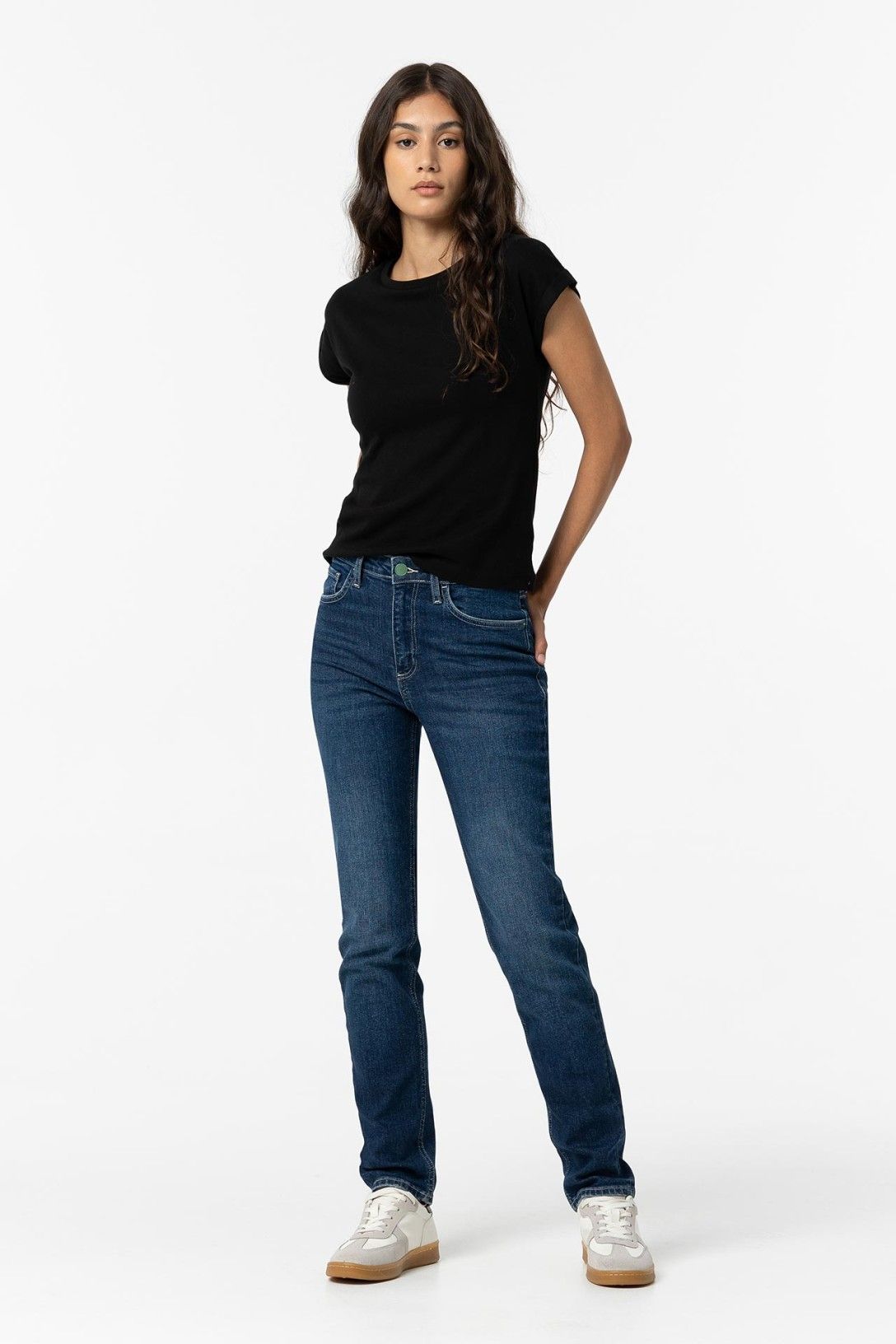 Jeans de cintura alta com cinco bolsos. fecho frontal com fecho zip e botão metálico.