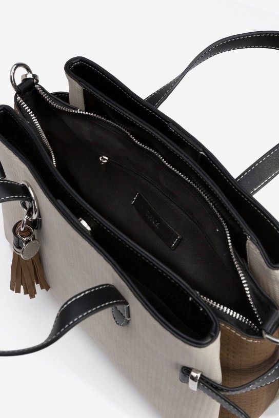 Mala bege com alças pretas, fecho de correr, detalhe de franjas e laterais castanhas.
