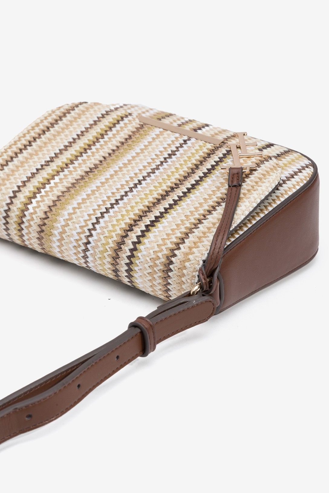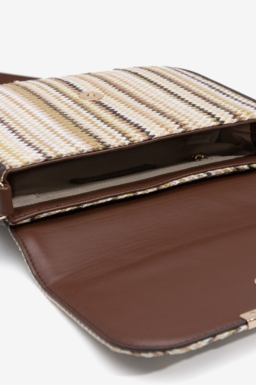 Mala castanha em palha entrançada com alça ajustável e fecho magnético discreto.