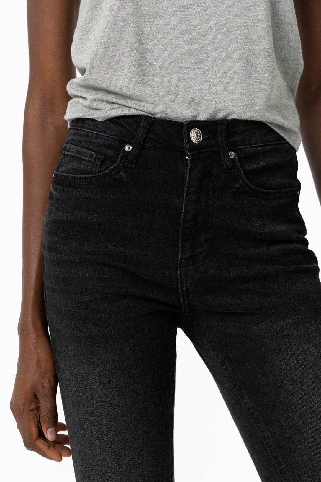 Jeans de cintura alta com cinco bolsos. fecho frontal com fecho zip e botão metálico. bainha desfiada.