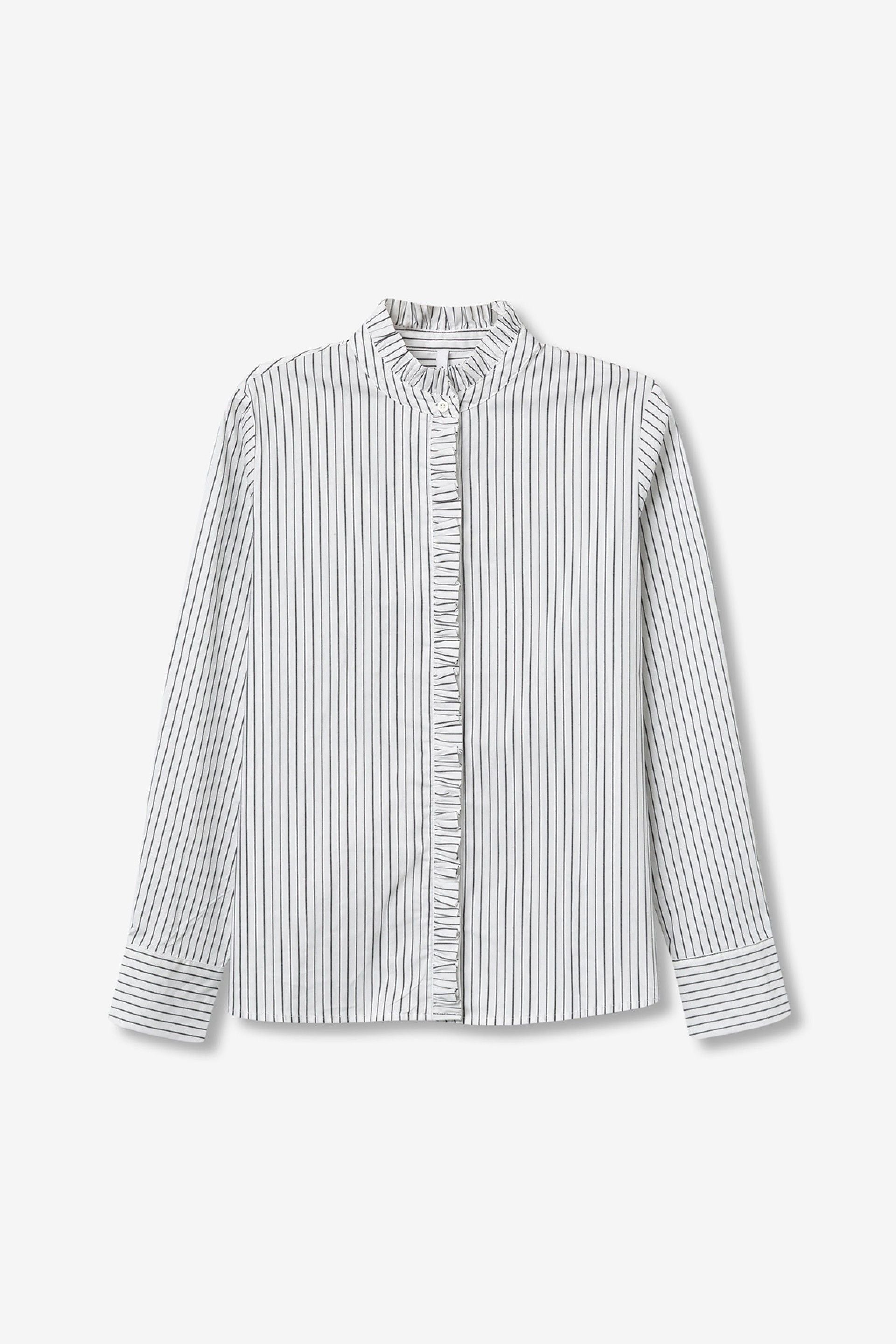 Camisa regular fit às riscas com folho no colarinho e na carcela. colarinho redondo, manga longa com botões nos pulsos e fecho de botão interno.