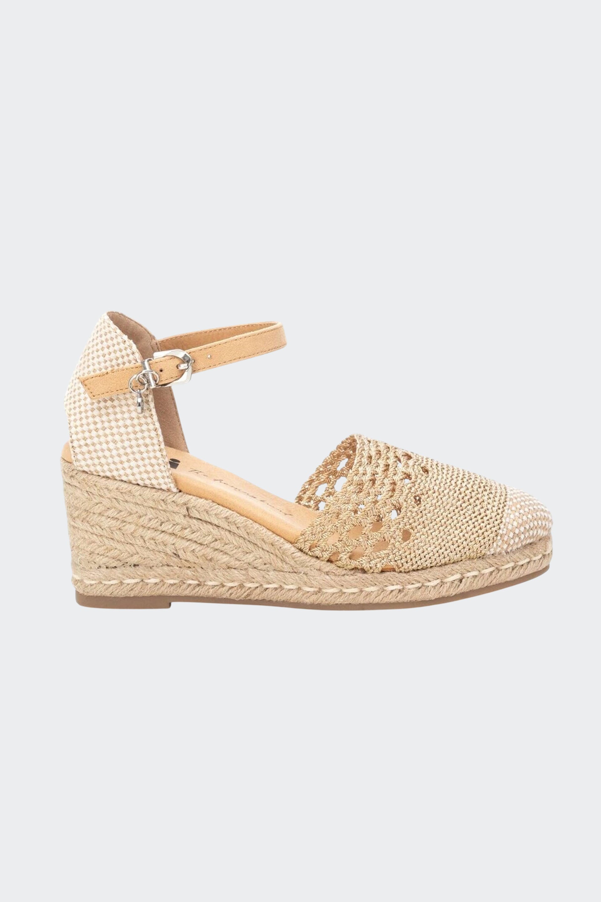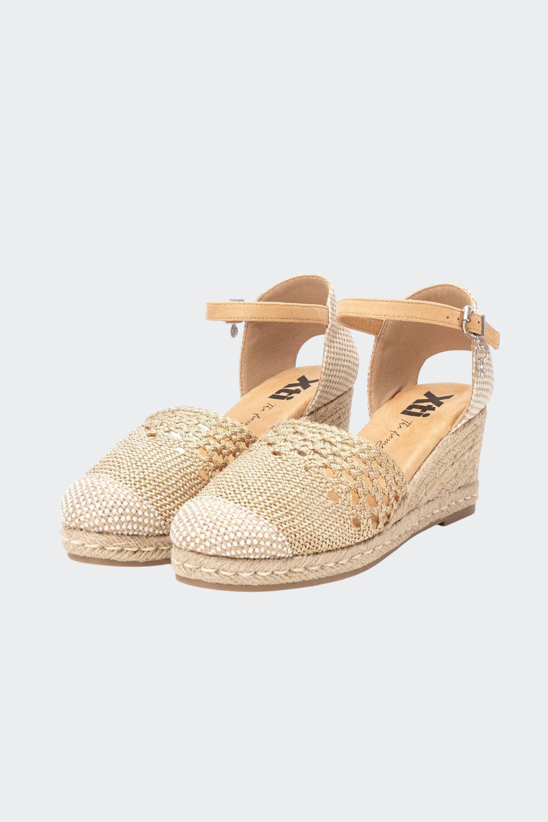 Sandalia feminino com cunha, tipo valenciano, da marca xti. feito em tecido de crochê, esse modelo vai te acompanhar em todos os seus looks de verão. pulseira de tornozelo com fecho de fivela. cunha de 6 cm forrada com juta e sola de borracha antiderrapante. este modelo foi certificado como vegano pela organização global peta (animal rights organization).