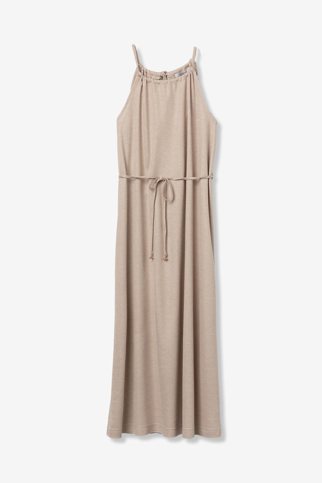 Vestido de cor bege, corte regular, alças finas, decote franzido e cinto ajustável na cintura.