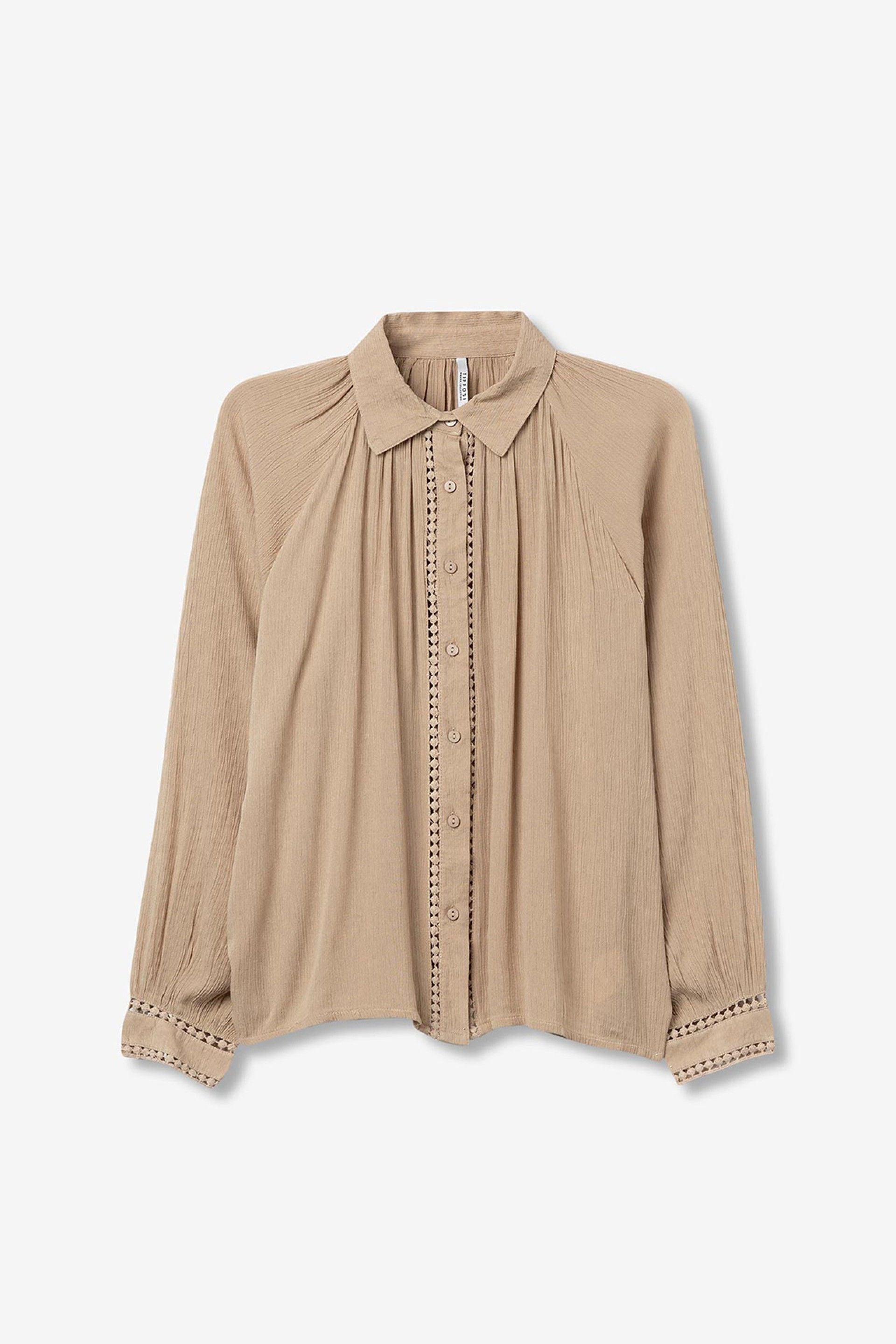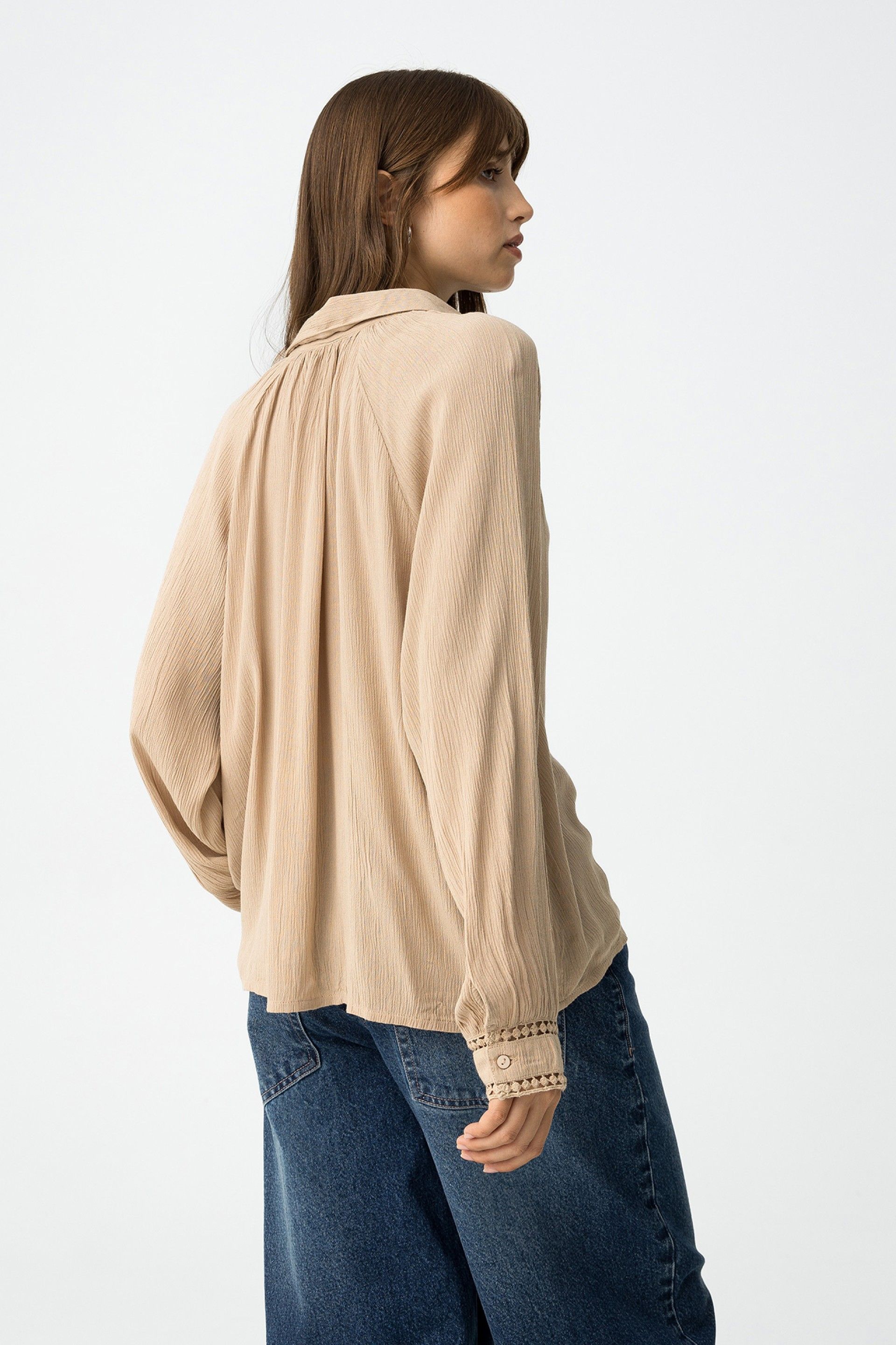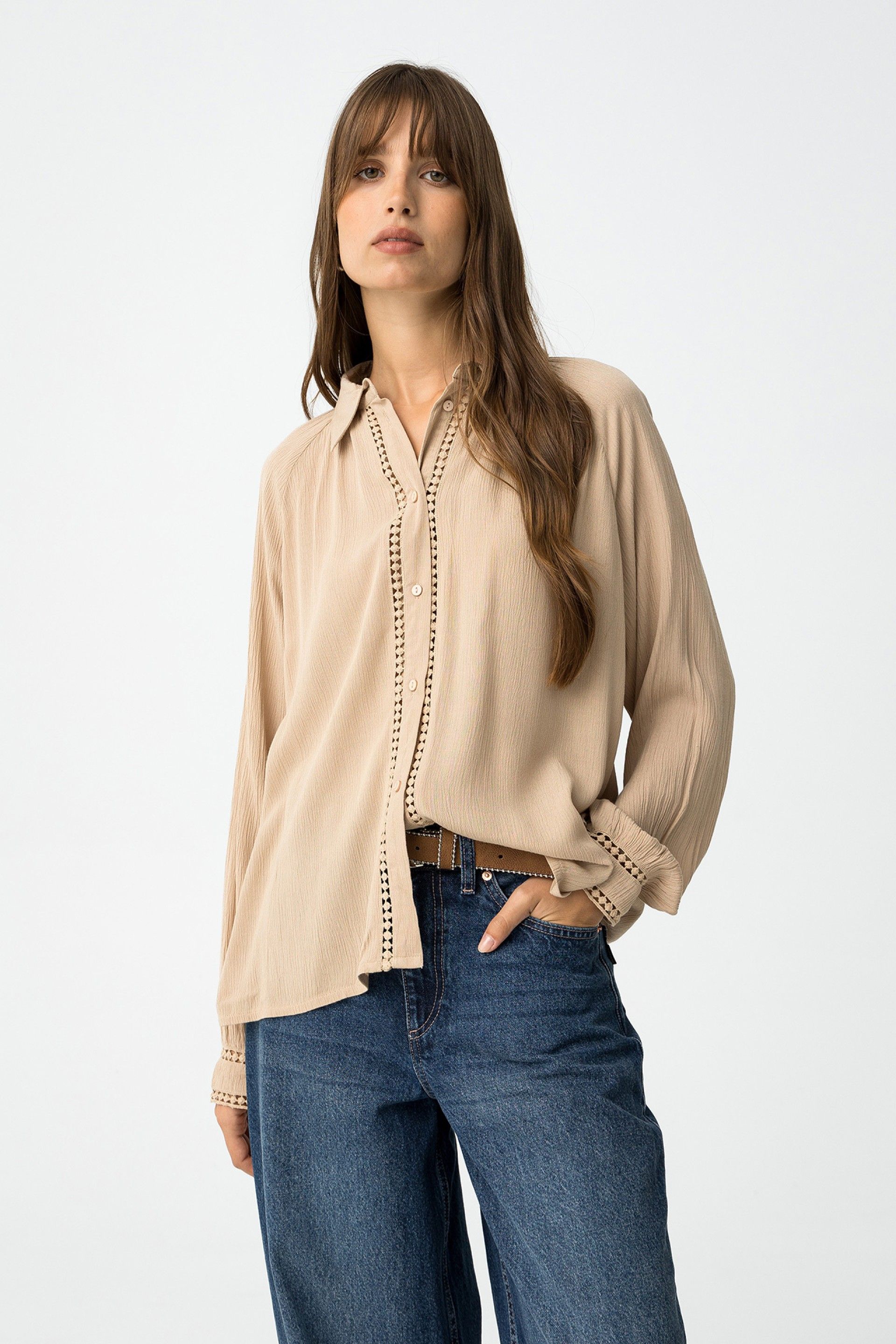 Camisa relaxed fit com textura e recortes de renda. colarinho, manga longa, fecho de botão frontal e bainha curva.